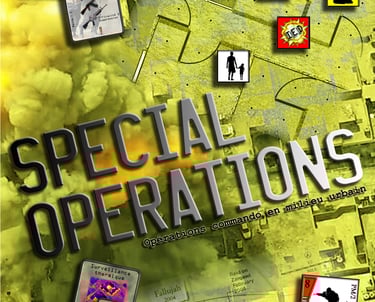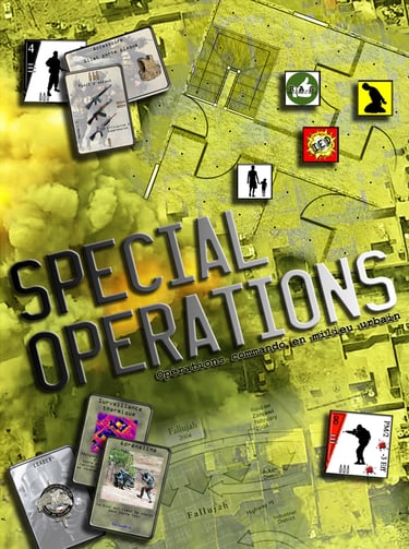 SPECIAL OPERATIONS propose de simuler des affrontements urbains entre de petites formations de type commando, lors de conflits actuels ou récents : Irak, Mali, Syrie, Lybie... L’utilisation de blocs crée le brouillard de guerre qui caractérise ce type d’opération, et le graphisme met en avant l’importance des éléments de couverture, des angles de vue et les lignes de tir. Inspiré par Urban Operations, il en conserve une grand partie des mécanismes, adaptés à une échelle où un bloc représente un seul individu, combattant ou civil. Un jeu de Philippe Jaranton