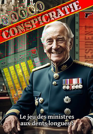 CONSPICRATIE : un card driven cynique pour 3 à 5 joueurs, dont le thème est la compétition entre les ministres d'un président en fin de vie dans une "république autoritaire" actuelle en déclin.